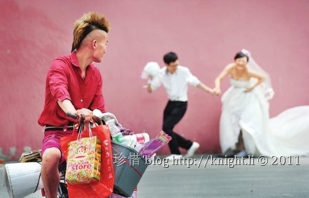 叮铛在大慈寺旁欣赏一对新人拍婚纱照