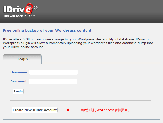 在使用这个功能前,要做好两项准备工作:1. 在你的Wordpress里安装IDrive提供的插件(点击下载);2. 成为IDrive的注册会员。这里需要注意的是第二点,不要在IDrive官方页面注册,否则将因为会员类型的问题而无法使用Wordpress备份服务,正确的注册方式是在安装好插件后,在插件页面中注册!