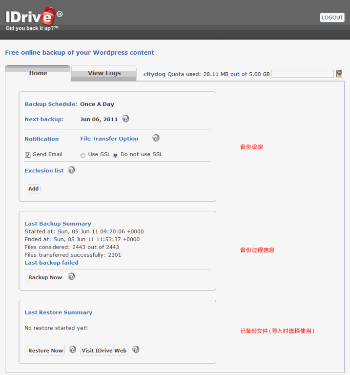 另外,IDrive的默认备份频率为每天一次,有点频繁,如果不打算按这个频率备份,你只要退出插件的登录界面就行(点右上角的LOGOUT),等你想备份的时候,重新登录即可!
