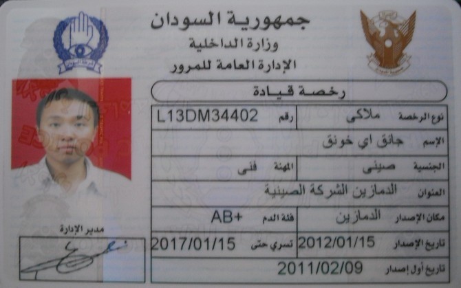 忙活了一个星期了,我的苏丹驾照终于办理下来了,早上本来还有点担心会花很长时间,结果去了以后才知道,人家苏丹穷是穷,办事效率那比中国可是高多了。大家说说这国内半个驾驶本得花多少时间,只是说在局子里的,你学车什么的就不参合了,反正我知道需要很久。而今天我早上去,直到办理好,我拿到本一共才花了3小时不到,可想而知中国警察的办事效率了。其实我在这边也不开车,不过还是办一本吧,回国用呗,回国后可以转成中国驾照,这样便宜不少哦!下面把我的苏丹驾照贴出了大家瞅瞅。如果谁会阿拉伯语的话,顺便帮我翻一下上面写的是什么东东啊!驾照肯定是真家伙,因为自己到警察局办的嘛O(∩_∩)O~