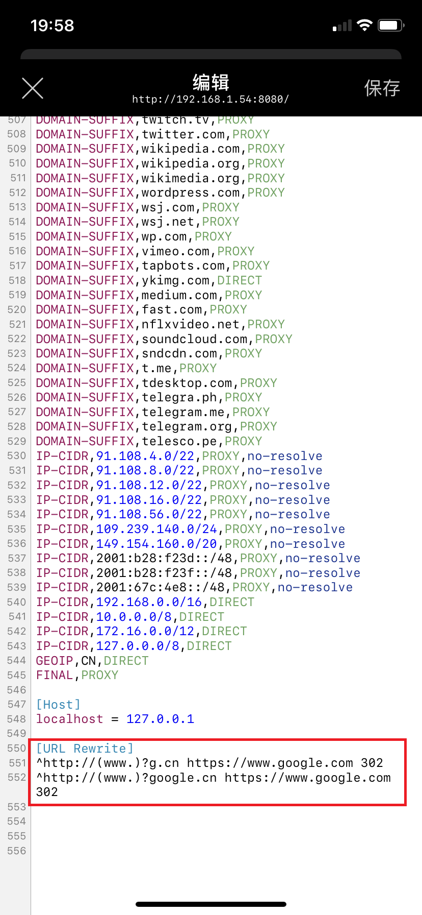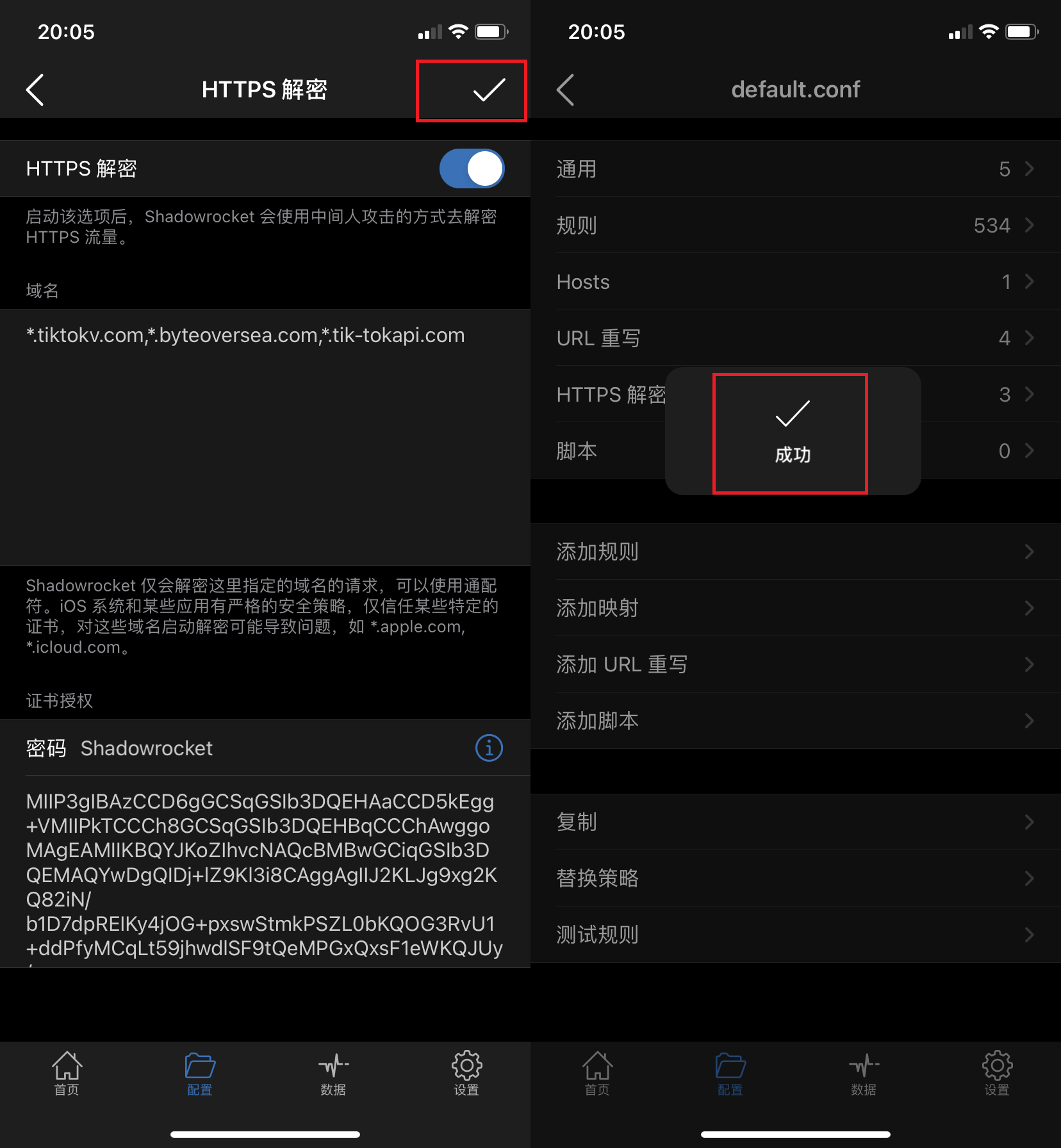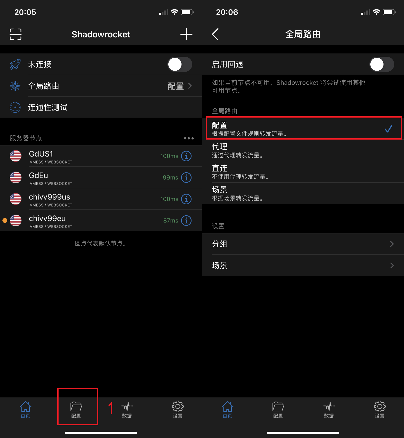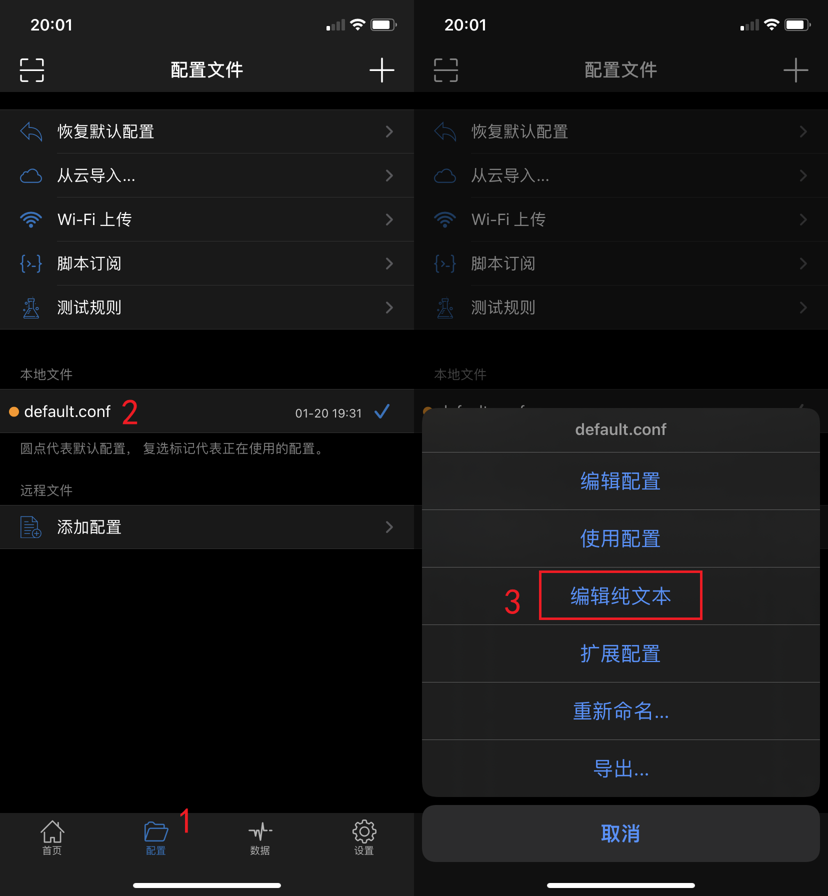 - 我们打开小火箭,选择“配置”,然后点击default.conf,选择“编辑纯文本”