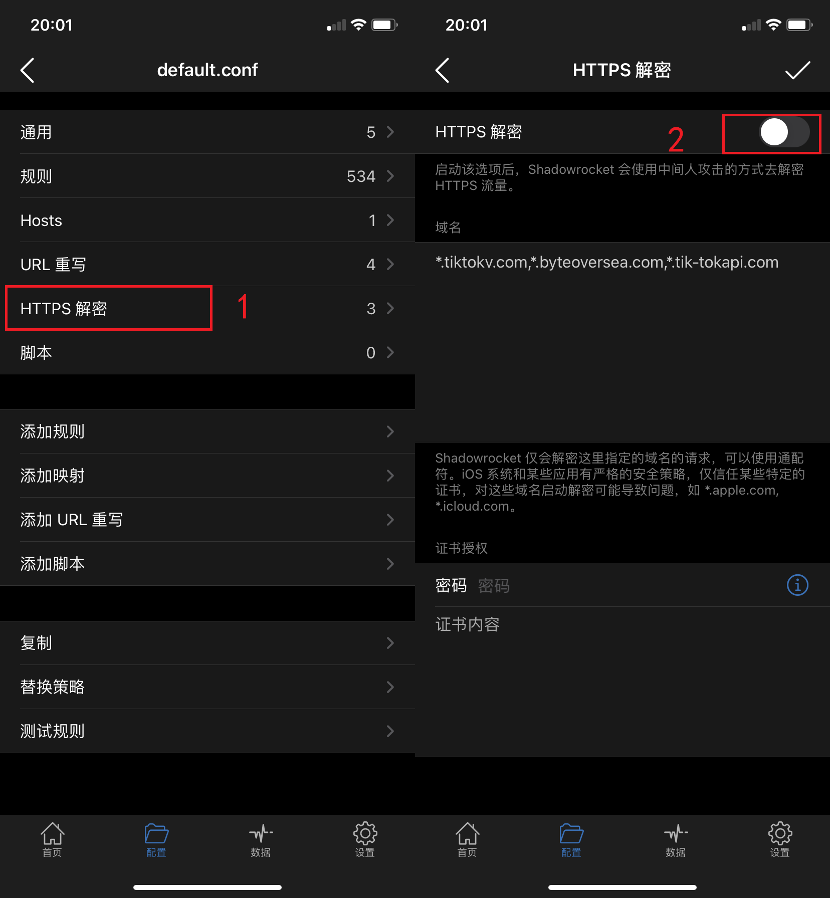 - 保存之后,选择“HTTPS解密”,然后激活按钮