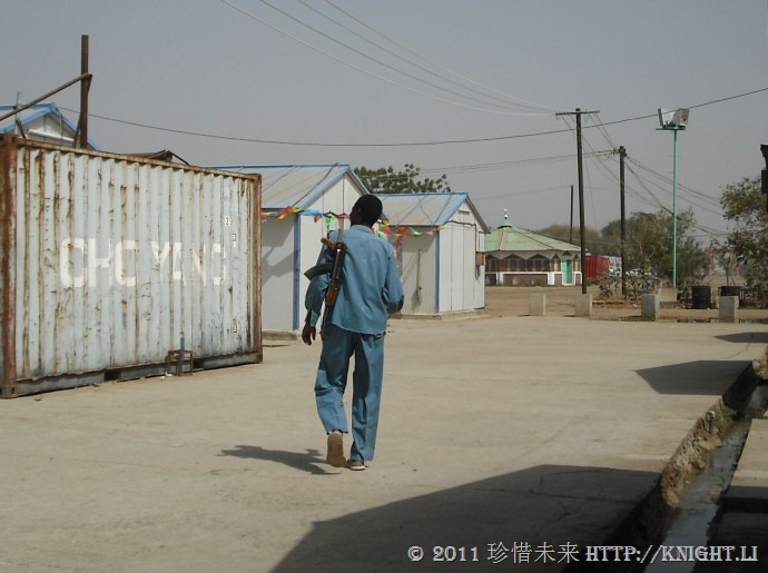 我们的营地在苏丹罗塞雷斯大坝的的坝脚下,也是南北交界处。现在苏丹国内正在闹分裂,苏丹南北战争已经打了20年了,总计共有200万人因此而失去了生命。自然我们这里也属于保护单位了,下图为我们营地中巡逻的士兵。